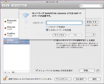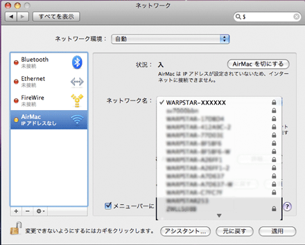 [表示]を[AirMac]にして、[AirMac]タブをクリックする |