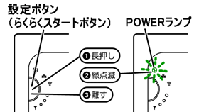設定ボタン(らくらくスタートボタン)を長押しし(約6秒)、POWERランプが緑点滅になったら離す