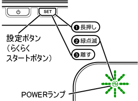 通常点灯したらすぐに設定ボタン(らくらくスタートボタン)を長押しし(約6秒)、POWERランプが緑点滅になったら離す