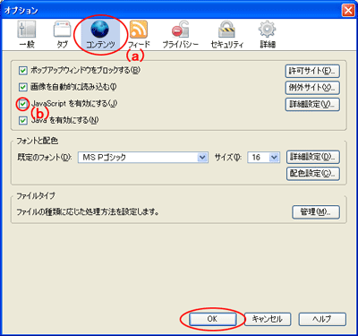 [JavaScriptを有効にする]にチェックする(<図1>の(b))