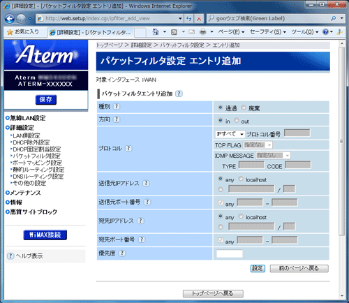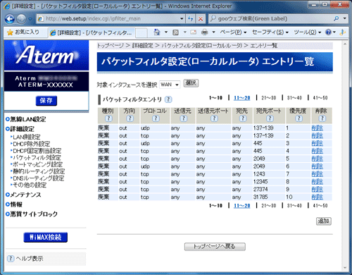 「パケットフィルタ設定 エントリ」のエントリ一覧に表示されているエントリの中から、削除したいエントリの行末の[削除]をクリックすることで削除できます。 |