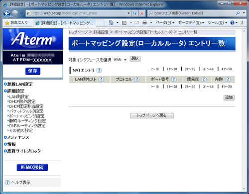 本商品では、[NATエントリ]のパターンを最大50個設定できます。 |