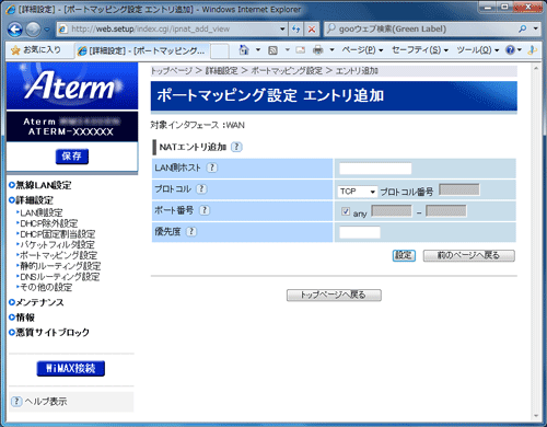 [追加]をクリックすると[ポートマッピング エントリ追加]画面に進みます。 |