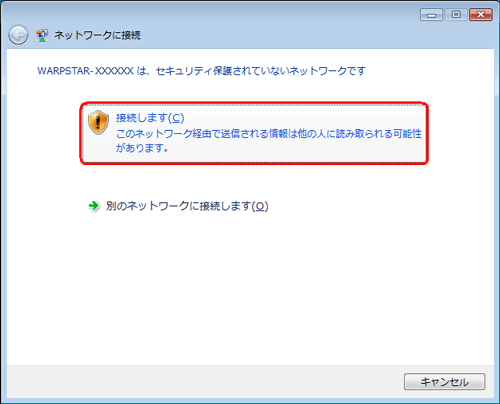無線LANアクセスポイント(親機)のネットワーク名(SSID)を選択し[接続]をクリックします。 |