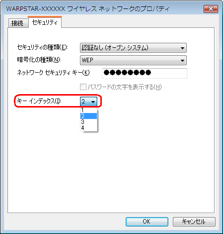 暗号化モードでWEPを使用する場合は、[キーインデックス]で無線LANアクセスポイント(親機)に設定したキー番号を選択します。 |