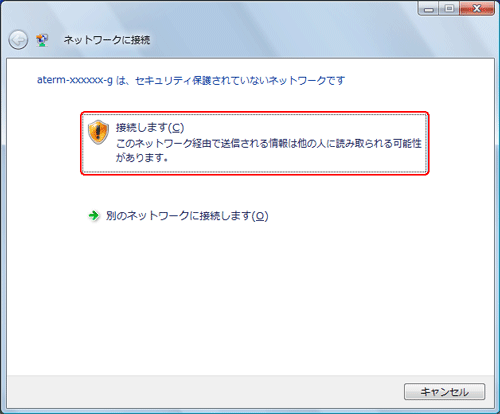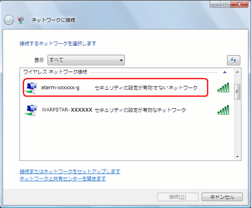 無線LANアクセスポイント(親機)のネットワーク名(SSID)を選択し[接続]をクリックします。 |