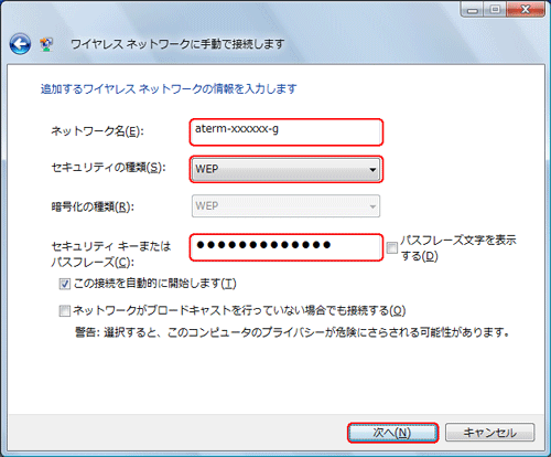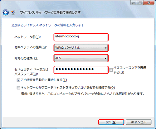 [セキュリティキーまたはパスフレーズ]に無線LANアクセスポイント(親機)の暗号化キーを入力する |