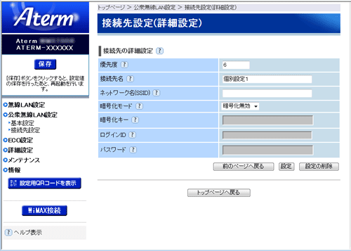 [アクセスポイント設定]をクリックすると、接続先設定(詳細設定)画面が表示されます。 |