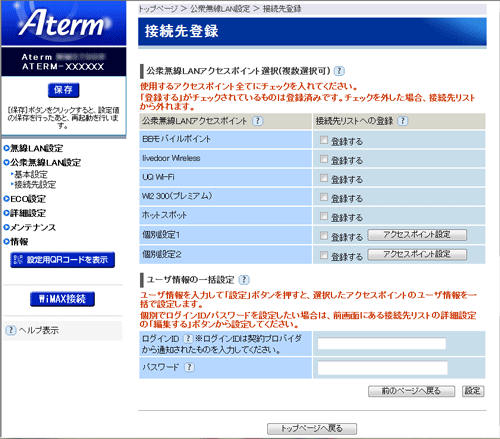 | 「登録する」チェックボックスにチェック後、ユーザ情報を入力して「設定」ボタンを押すと、選択した公衆無線LANアクセスポイントのユーザ情報が設定されます。個別に設定したい場合は、接続先リストの詳細設定項目の「編集する」から変更してください。 |