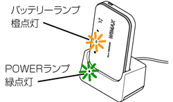 充電が開始され、本体のバッテリーランプが橙点灯し、クレードル側のPOWERランプが緑点灯する