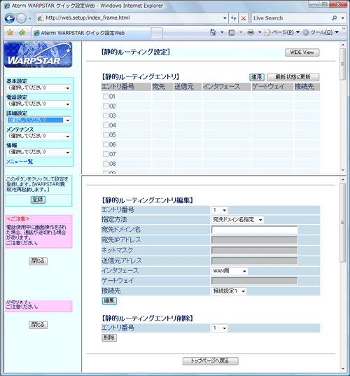 複数の静的ルーティングエントリを編集する場合には、上記の1〜2を繰り返してください。 |