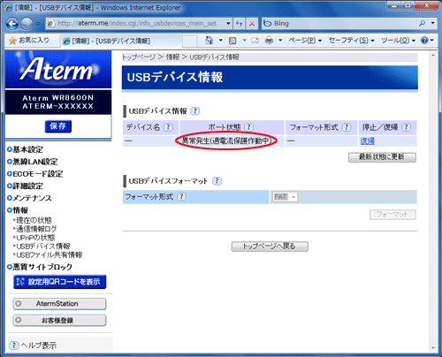 「USBデバイス情報]の「フォーマット形式」に「フォーマット中」と表示されます。 |