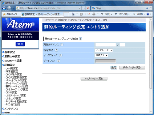 | ※画面の[追加]をクリックすると[静的ルーティング設定 エントリ追加]画面に進みます。 |