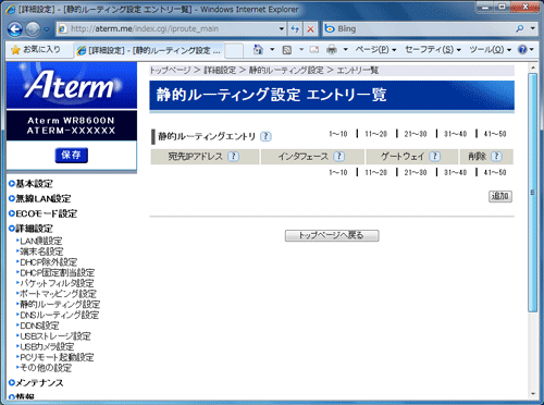 本商品では、[静的ルーティングエントリ]のパターンを最大50個設定できます。