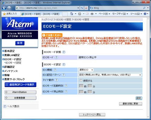 ECO設定パターン (初期値:設定1(無線LAN:停止、有線LAN:10Mbps、USB:停止)) |