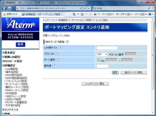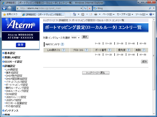 | ※画面の[追加]をクリックすると[ポートマッピング エントリ追加]画面に進みます。 |