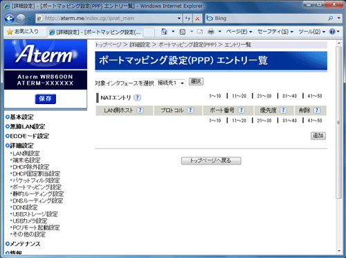 | ■ポートマッピング設定(PPP) エントリ一覧 |