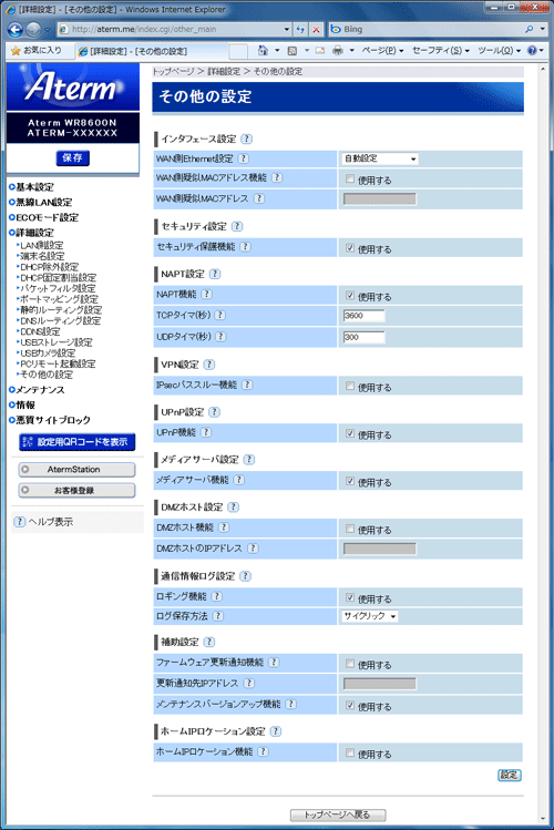 | UPnP(ユニバーサル・プラグアンドプレイ)機能に関する設定を行います。 |