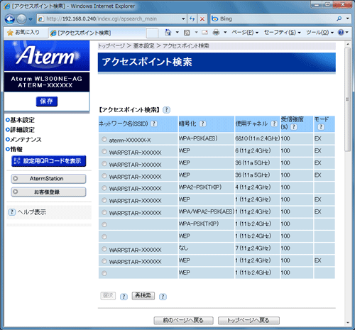 [アクセスポイント検索]をクリックして[アクセスポイント検索]画面を表示してネットワーク名(SSID)を選択することもできます。