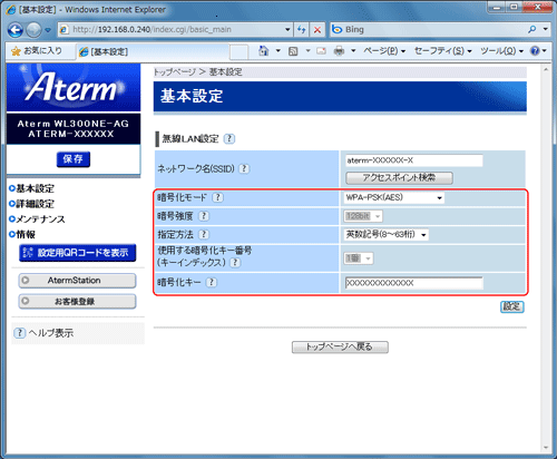 無線LANアクセスポイント(親機)の暗号化設定に合わせて暗号化の設定を行う |