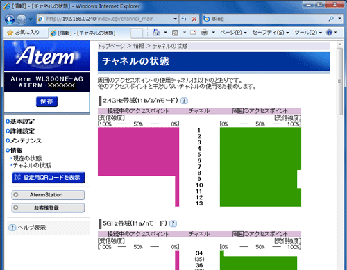 | 周囲の無線LANアクセスポイント(親機)のチャネルの状態を表示します。 |
