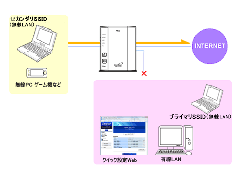 マルチSSIDのそれぞれのネットワーク(プライマリSSID/セカンダリSSID)に接続した無線LAN端末(子機)や、有線で接続したパソコンへのアクセスを制限し、本商品に接続した他のネットワークから分離することができます。(WAN側が分離されることはありません。)