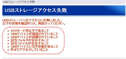 - USBデバイスにアクセス開始時、または操作中に、下記の画面が表示された場合、USBデバイスへのアクセスに失敗しています。
