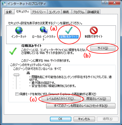 [信頼済みサイト](<画面1>の(a))を選択して、[サイト](<画面1>の(b))をクリックする |