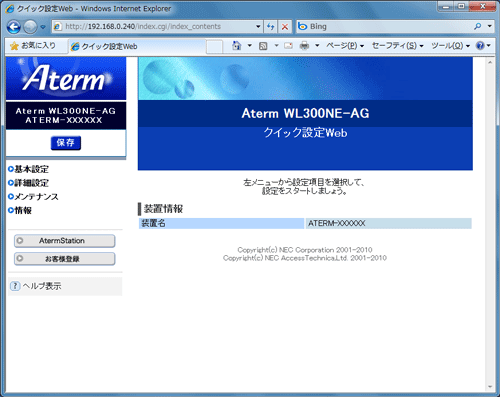 WWWブラウザを起動し、本商品のIPアドレスを入力し、設定画面のページを開く
