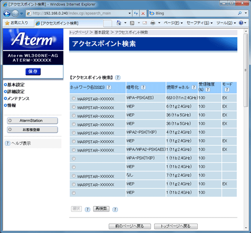 [アクセスポイント検索]をクリックして[アクセスポイント検索]画面を表示してネットワーク名(SSID)を選択することもできます。