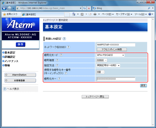 無線LANアクセスポイント(親機)の暗号化設定に合わせて暗号化の設定を行う |