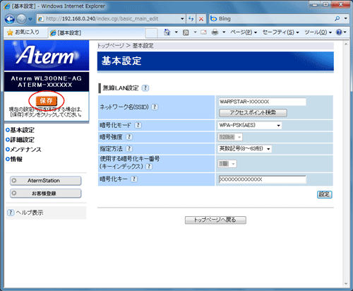 管理者パスワードは、WL300NE-AGを設定する場合に必要となりますので、控えておいてください。