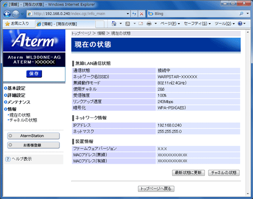 | WL300NE-AGの無線LAN通信状態、ネットワークの情報、装置情報を表示します。画面は30秒ごとに自動更新されます。 |