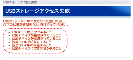 - USBデバイスにアクセス開始時、または操作中に下記の画面が表示された場合、USBデバイスへのアクセスに失敗しています。