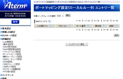 | ■ポートマッピング設定(ローカルルータ) エントリ一覧 |