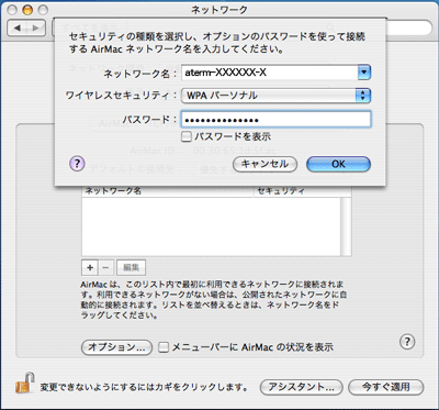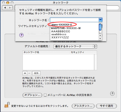 - Mac OS X v10.5、v10.6 をご利用の場合は、「らくらく無線スタートEX」で無線接続することもできます。設定方法は、AtermStation(http://121ware.com/aterm/)-「ダウンロード」-「ソフトウェア」-「無線LAN親機」-「共通ソフトウェア(らくらく無線スタートEX)」の「Macintosh用ダウンロードページ」にある「Mac版らくらく無線スタートEXガイド」を参照してください。