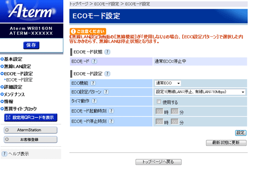 ECO設定パターン (初期値:設定1(無線LAN:停止、有線LAN:10Mbps)) |