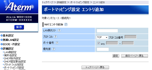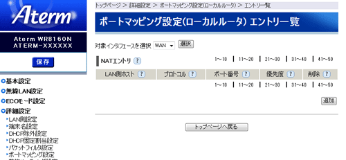 | ※画面の[追加]をクリックすると[ポートマッピング エントリ追加]画面に進みます。 |