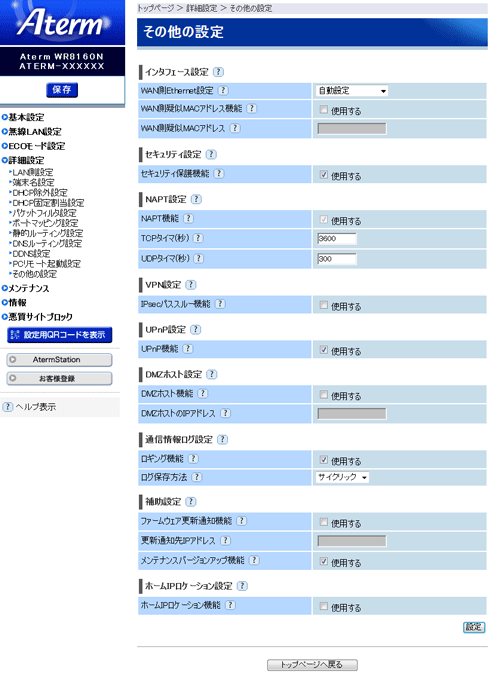 - 設定変更は即時有効となります。[設定]をクリックしたあと本商品にアクセスできなくなる場合があります。その場合は、WWWブラウザを一度終了し、接続する端末と本商品の設定をあわせたあと、WWWブラウザを開きなおしてください。