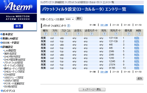 「パケットフィルタ設定 エントリ」のエントリ一覧に表示されているエントリの中から、削除したいエントリの行末の[削除]をクリックすることで削除できます。 |