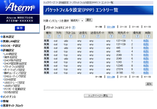 | ■パケットフィルタ設定(PPP) エントリ一覧 |