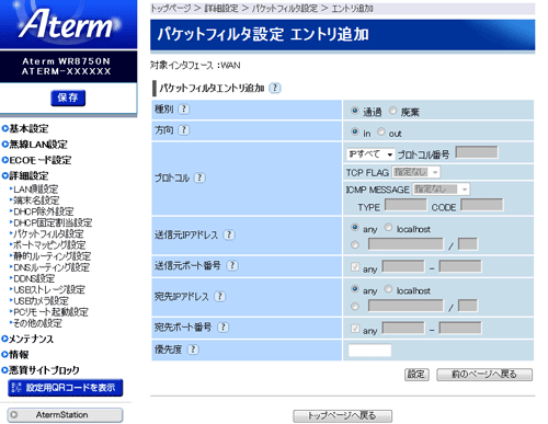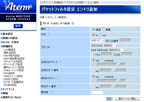 [追加]をクリックすると[パケットフィルタ設定 エントリ追加]に進みます。 |