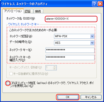 「ワイヤレス ネットワークのプロパティ」のアソシエーションタブで「ネットワーク名(SSID)」、「ワイヤレス ネットワークキー」を入力して[OK]をクリックする |