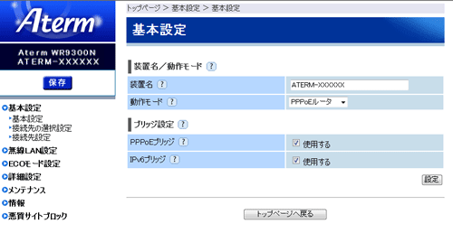 WAN側のインタフェースの伝送速度、および、伝送モードを選択します。通常、「自動設定」で使用してください。