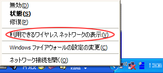 パソコン画面右下の通知領域(タスクトレイ)にある[ワイヤレス ネットワーク接続]アイコンを右クリックし、「利用できるワイヤレスネットワークの表示」をクリックします。 |