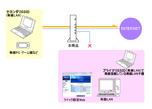 マルチSSIDのそれぞれのネットワーク(プライマリSSID/セカンダリSSID)に接続した無線LAN子機や、有線で接続したパソコンへのアクセスを制限し、本商品に接続した他のネットワークから分離することができます。(WAN側が分離されることはありません。)