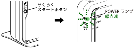 無線LAN親機のらくらくスタートボタンを長押し(約6秒)、POWERランプが緑点滅になったら放す