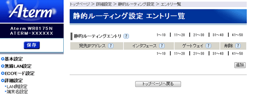 | ※画面の[追加]をクリックすると[静的ルーティング設定 エントリ追加]画面に進みます。 |