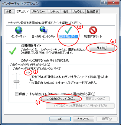 [信頼済みサイト]をクリックする(<図2>の(d)) |