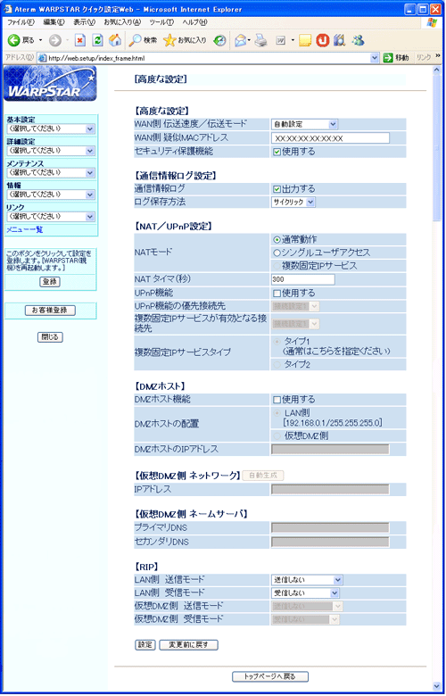 WAN側インタフェース伝送速度、および伝送モードを「自動設定、100Mbps/全二重、100Mbps/半二重、10Mbps/全二重、10Mbps/半二重」から選択します。 通常は自動設定で使用します。